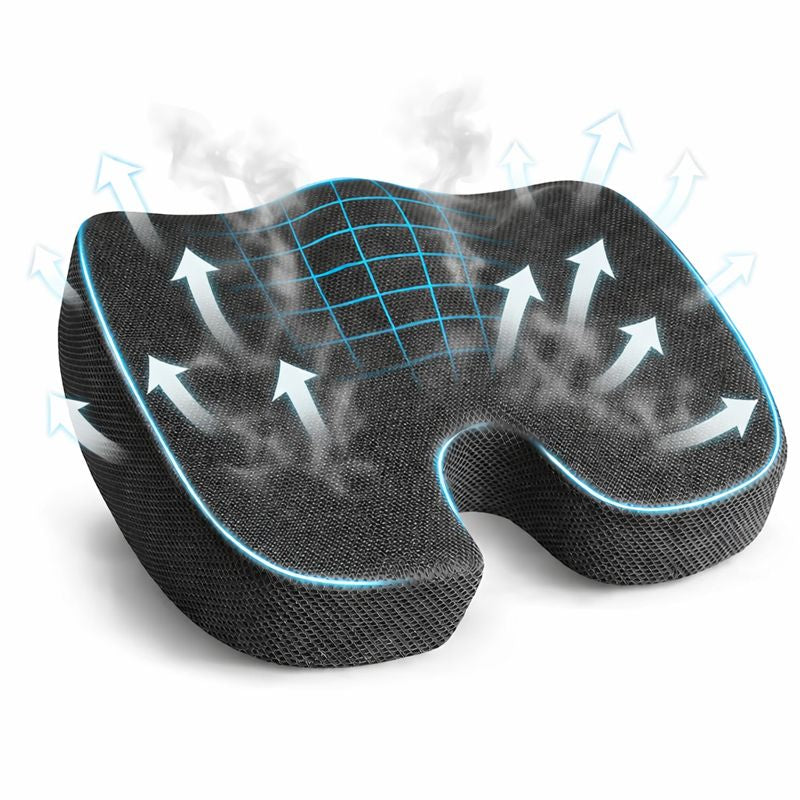 Ergonominen muotoilu jakaa painon tasaisemmin, vähentää painetta lantion ja häntäluun alueella sekä tukee parempaa istuma-asentoa. Hengittävä päällinen auttaa pitämään olon viileämpänä myös pitkissä istunnoissa.