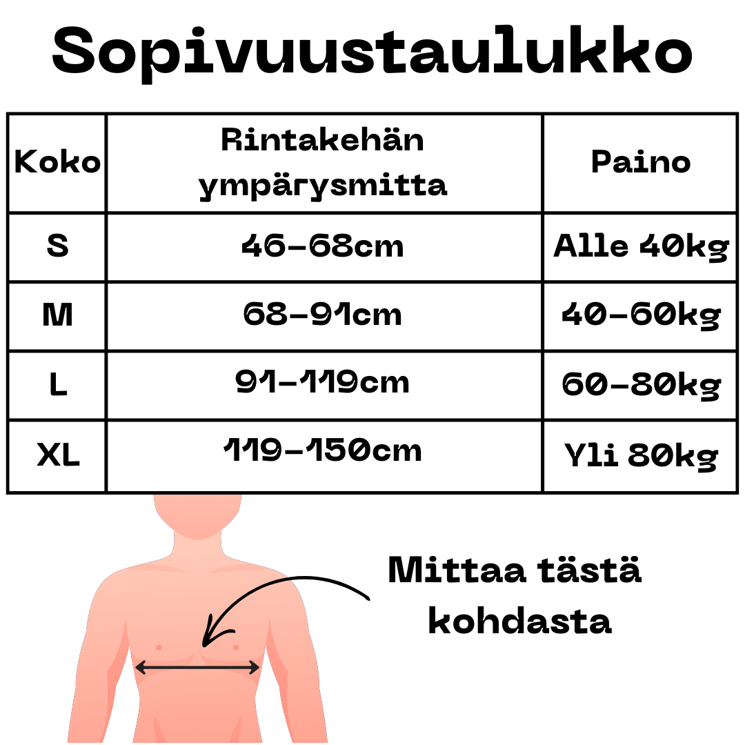 Jos liivi painaa ihoa, jättää jälkiä tai vaikeuttaa asennon korjaamista, se on liian tiukalla.